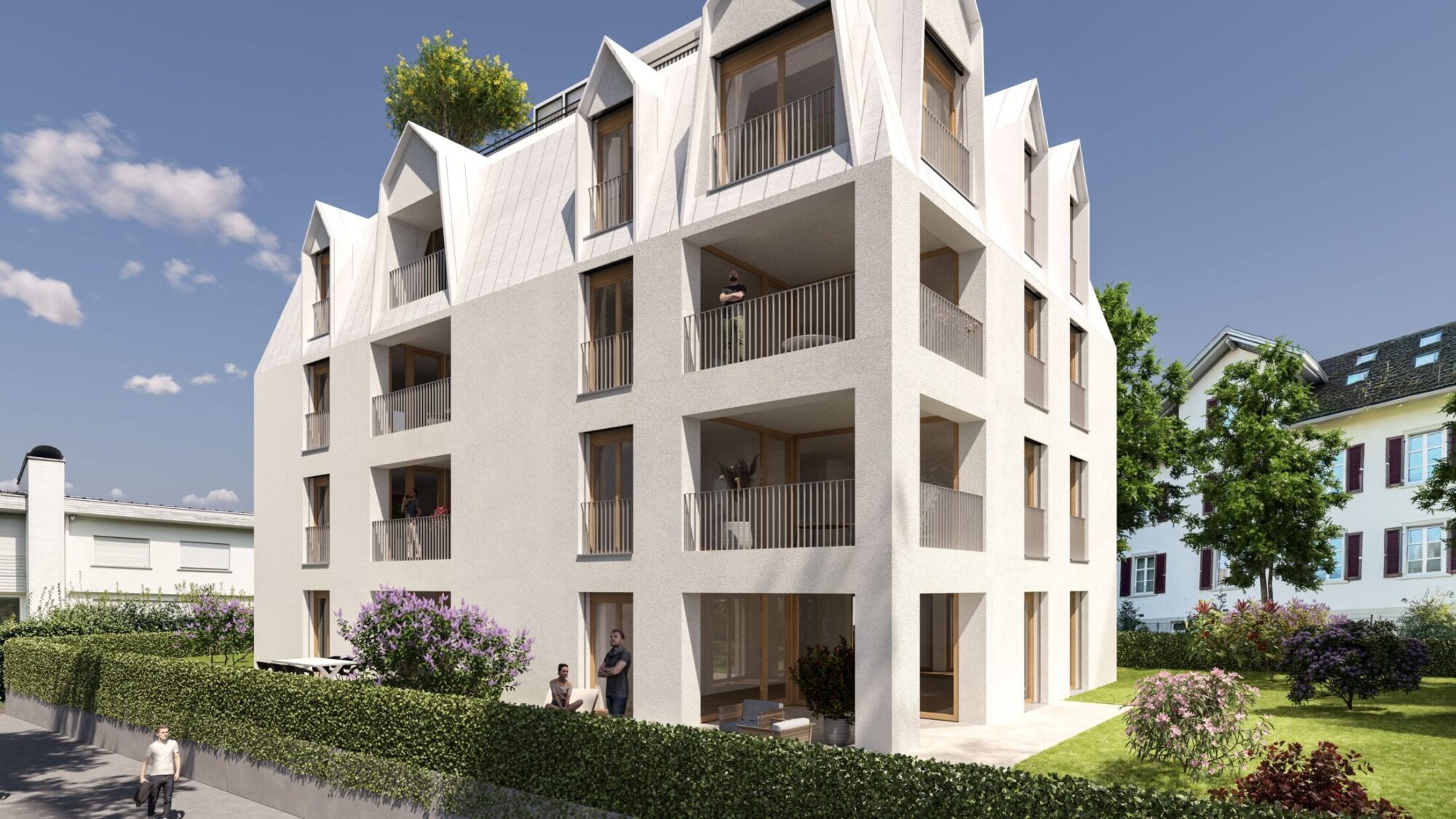 Diese Wohnung befindet sich im Erdgeschoss von Haus B und verfügt über eine Loggia, eine Terrasse und einen Garten mit gesamt ca. 200 m². Die Wohnung befindet sich aufgrund der Lage der Liegenschaft um ca. 1,40 m über dem Niveau der Jakob von Embs Straße und ist somit uneinsehbar.